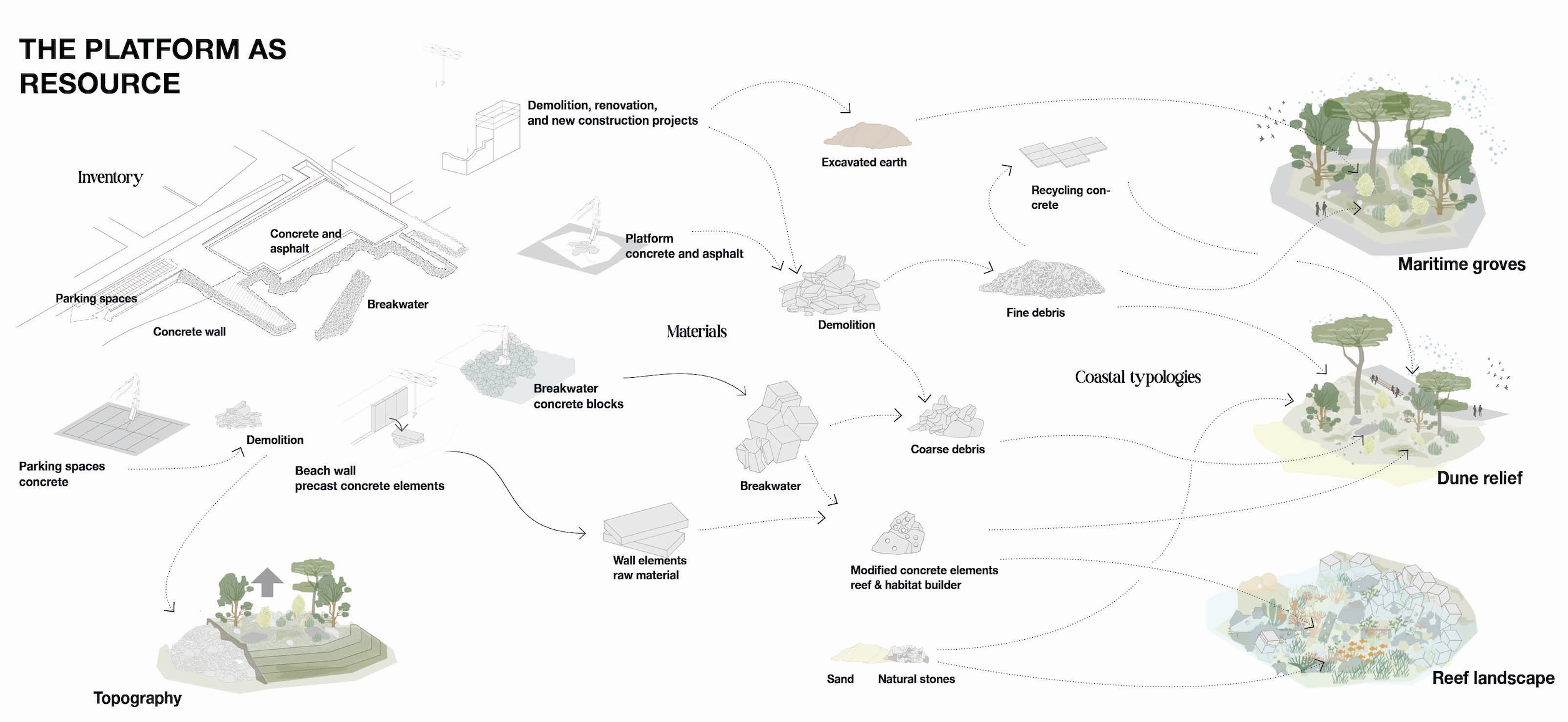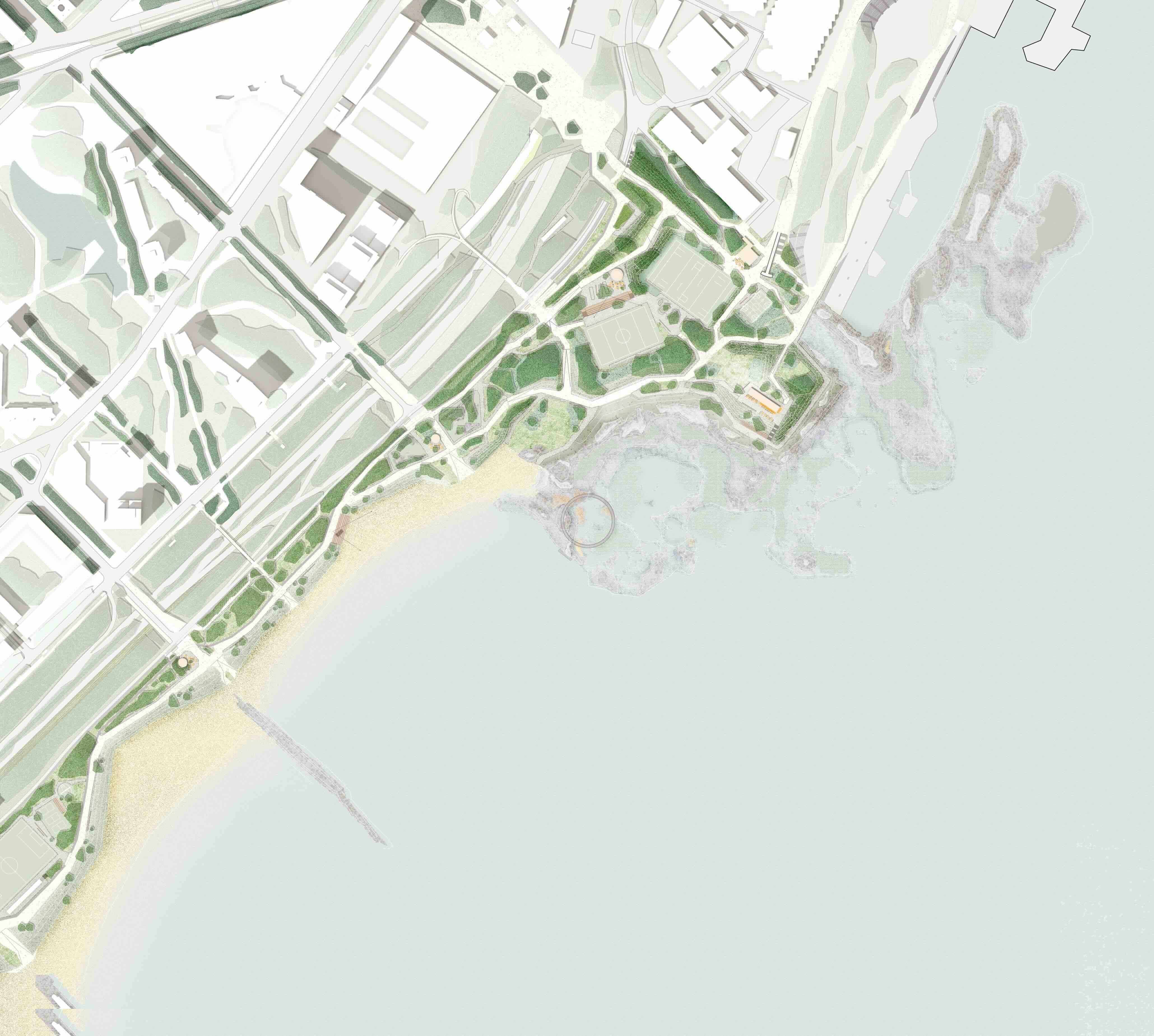 Barcelona is getting hotter and hotter. The coastal landscape of the Costa Maresme, which includes Barcelona, is characterized by concrete-covered beach promenades and concrete castles that seem to have lost their vitality. With our design, we want to break up the Plataforma Marítima as a relic of the concrete age and transform it into a lively coastal landscape. The basic shape of the platform will be modified and reduced in size. Asphalt, concrete, and various structural elements will be broken up, processed, sorted, and reassembled into differentiated coastal typologies. The result will be a diverse topographical and highly ecological coastal landscape that will continue to evolve and grow steadily.